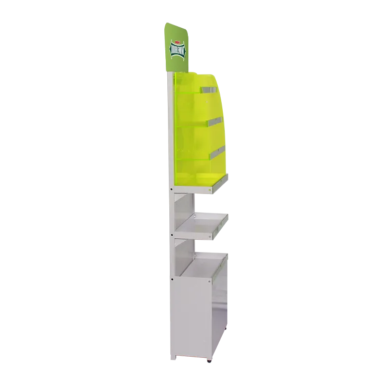 This acrylic element immediately differentiates the display from traditional metal racks. Under store lighting, the fluorescent acrylic creates a soft glow effect, enhancing shelf visibility without overwhelming the products.